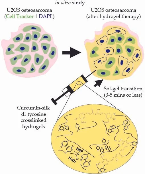 SLAB is extremely excited to share our first peer-reviewed publication showcasing a novel interaction between silk and curcumin. Curcumin is the active ingredient found in turmeric, a popular spice known for its anti-oxidant and anti-inflammatory properties. In this study we show that curcumin, known for its anti-oxidant properties, accelerates silk-tyrosine crosslinking reaction in the presence of HRP and H2O2, in a concentration dependent manner. We show that these hydrogels could be used as a targeted anti-cancer therapy when delivered to tumors such as osteosarcomas.